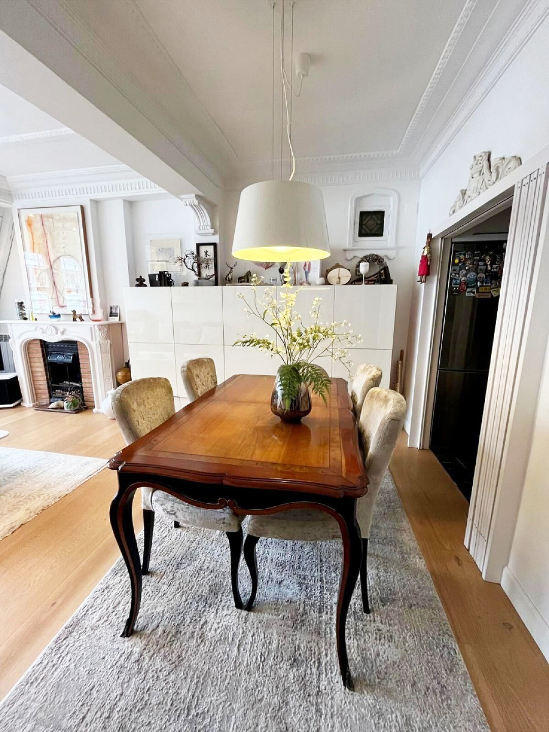 - 🪟 Bright, spacious living room with large panoramic windows, original moldings, and a decorative fireplace — a cozy and elegant setting for both quiet evenings and entertaining guests.