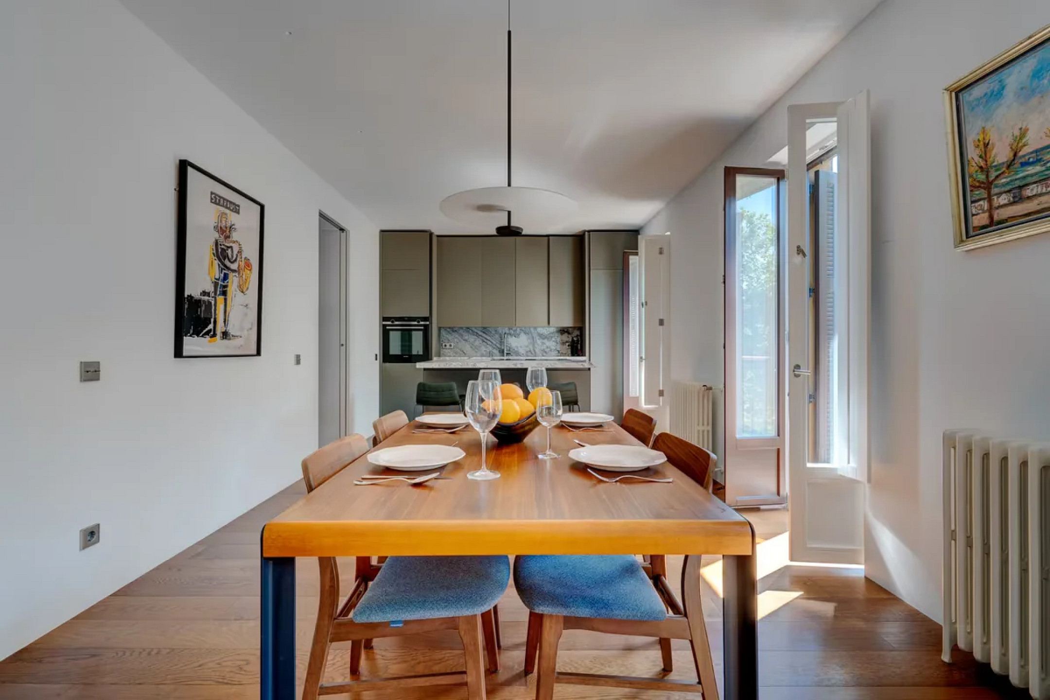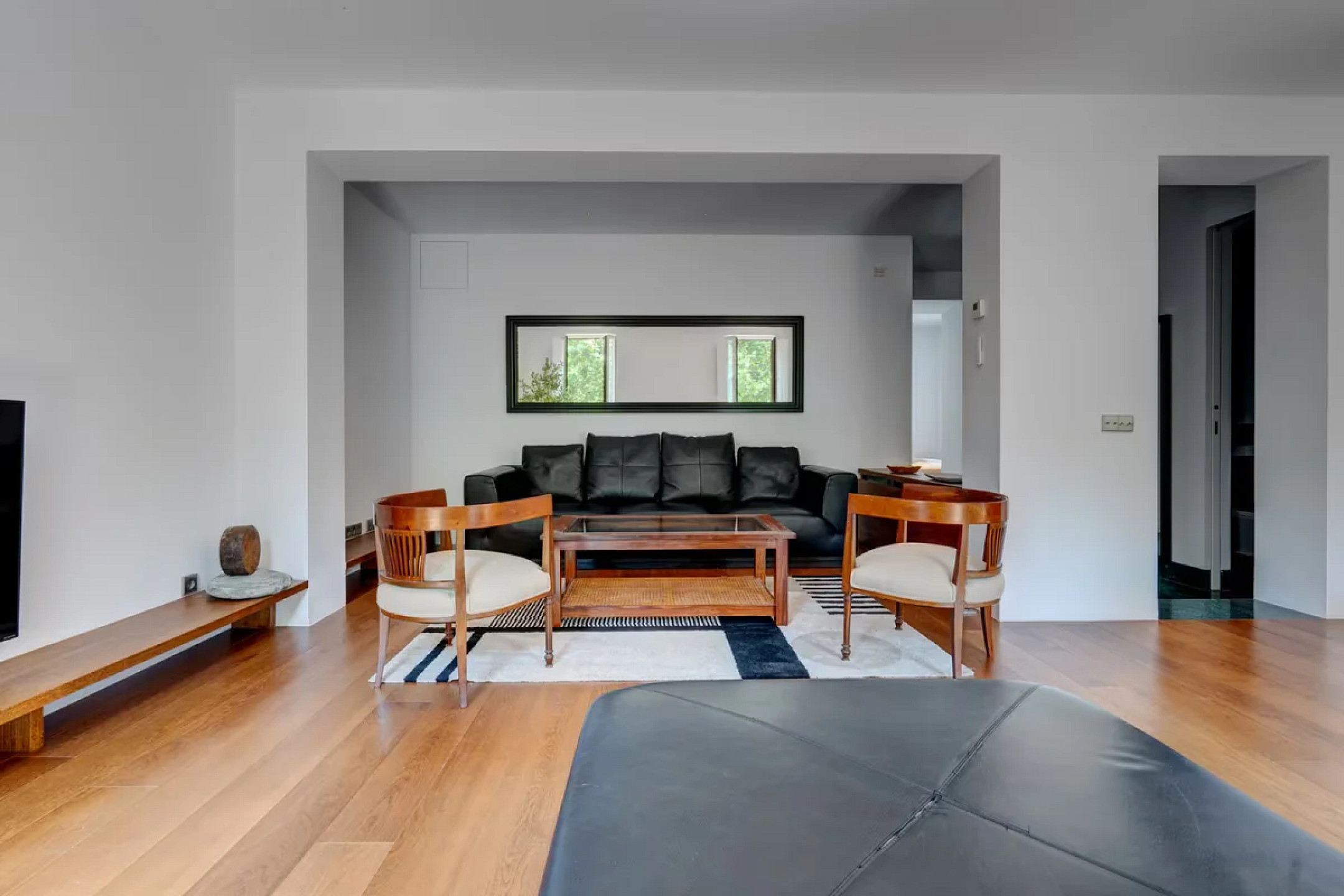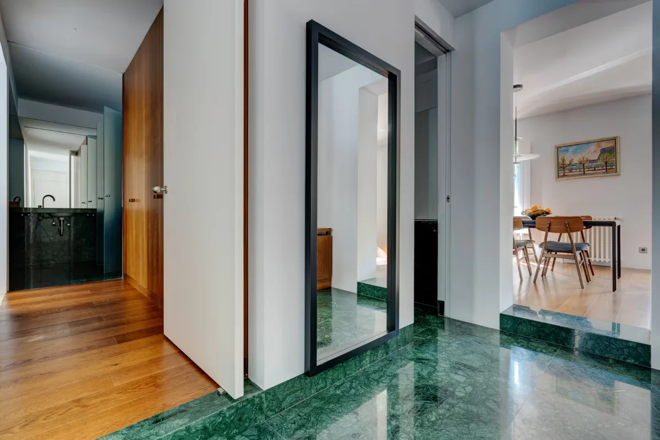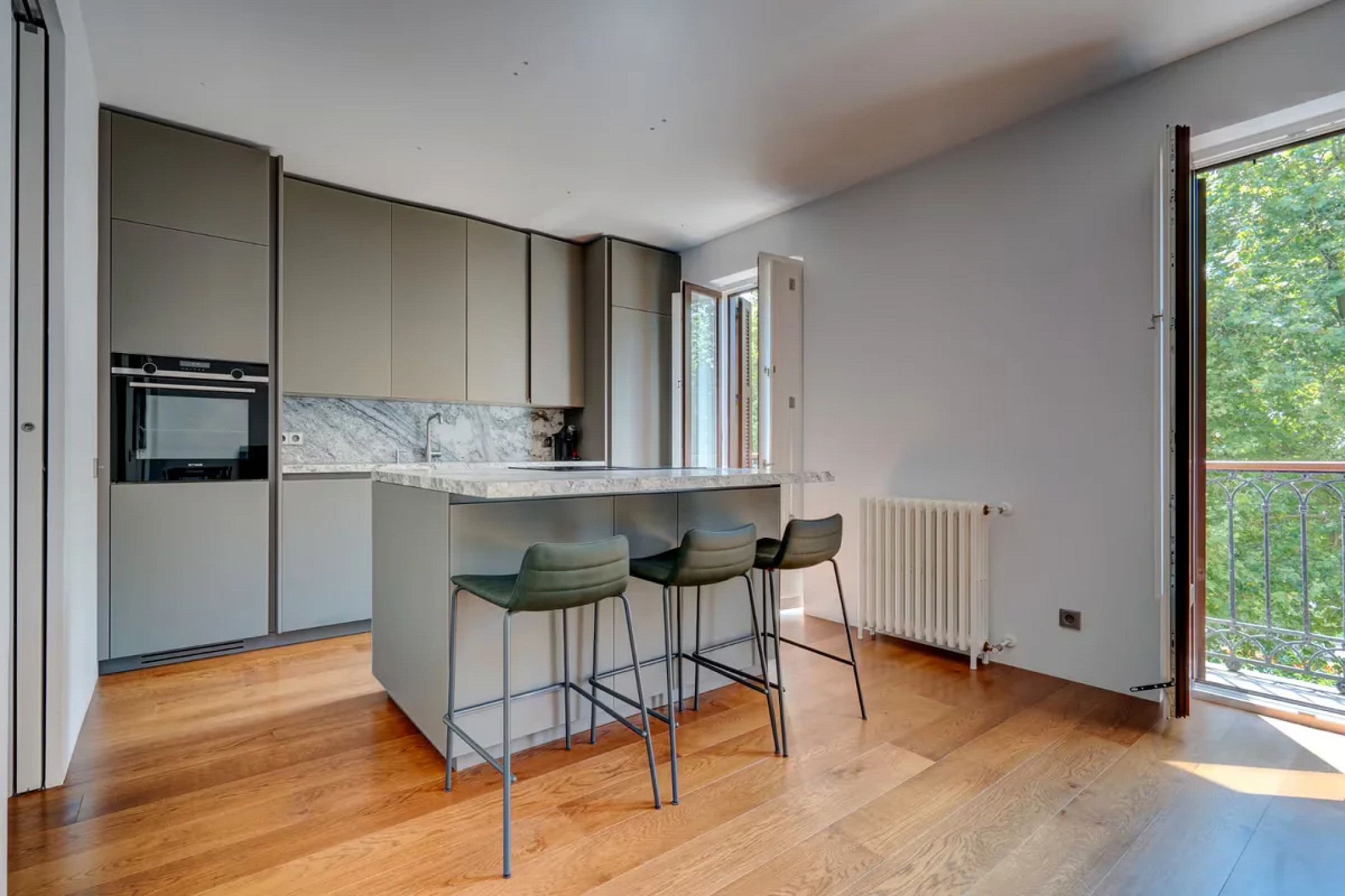Located on the third floor of a historic building, this 100 m² residence has been fully renovated in a refined contemporary style and is ready to move into. Its interior, awarded for excellence in architecture and design, reflects a deep sense of harmony — from the thoughtful layout to the flawless balance of materials and natural light.