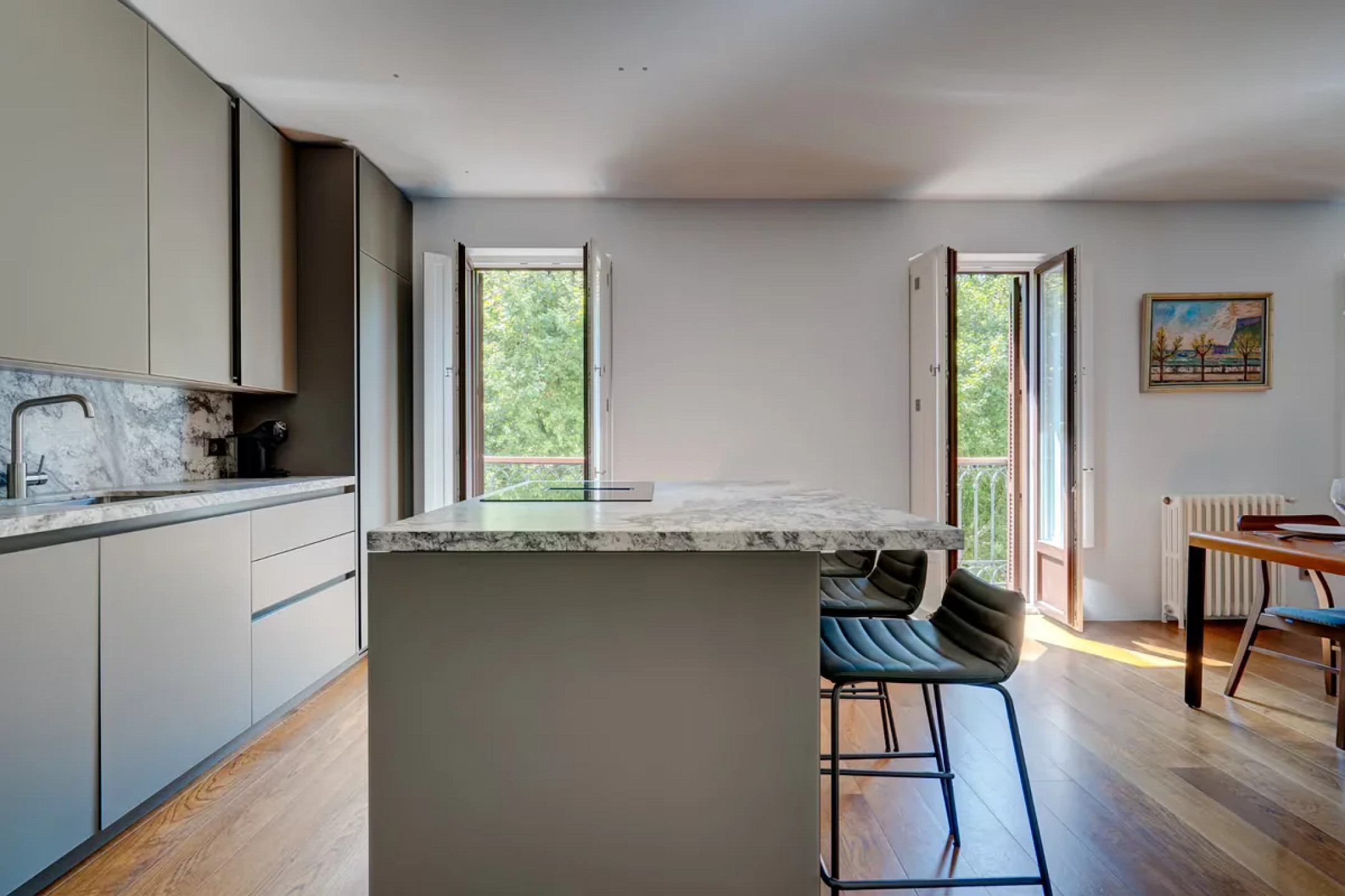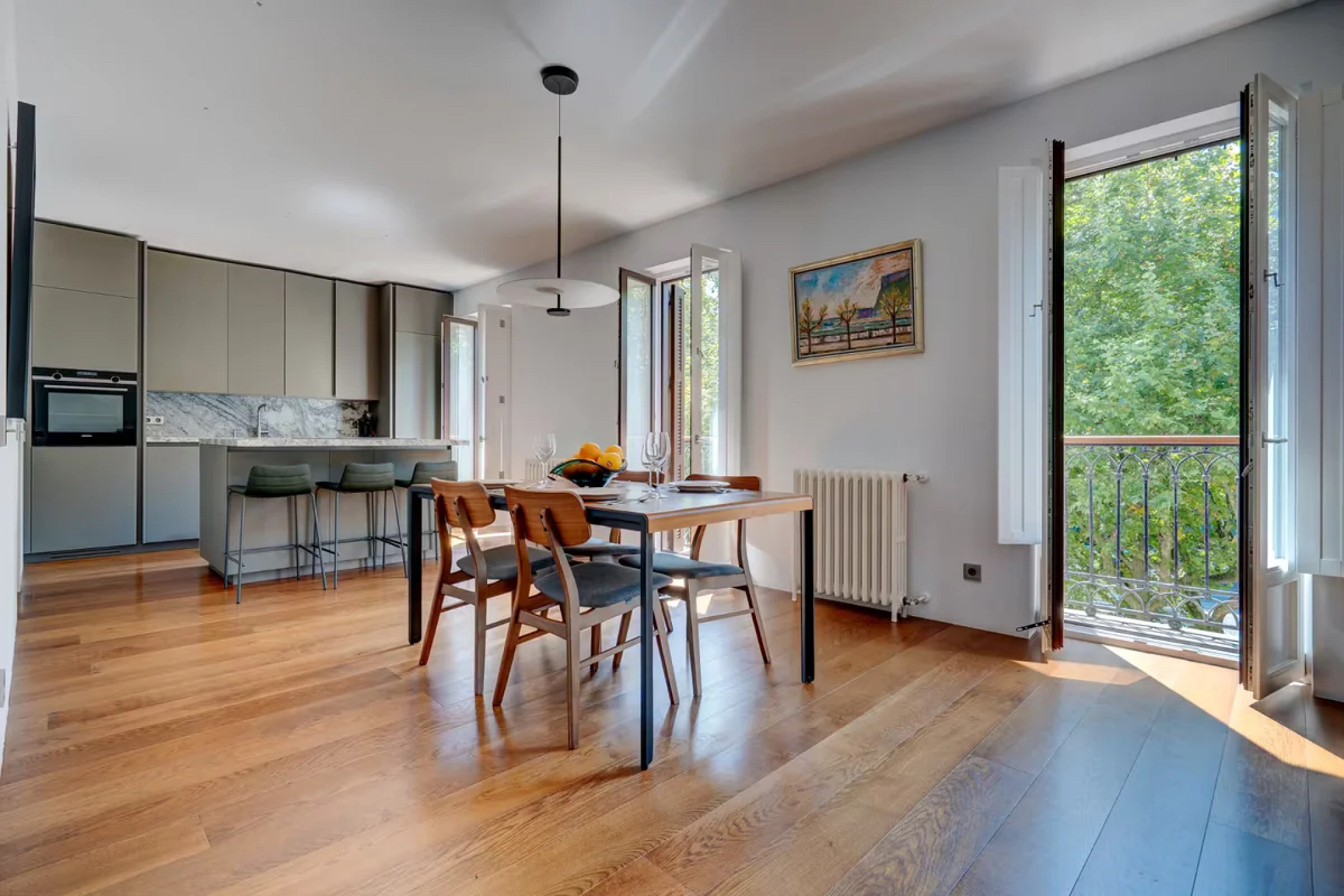 Large windows and balconies open onto one of the city’s most picturesque boulevards, filling the space with natural light and the timeless atmosphere of the historic center.