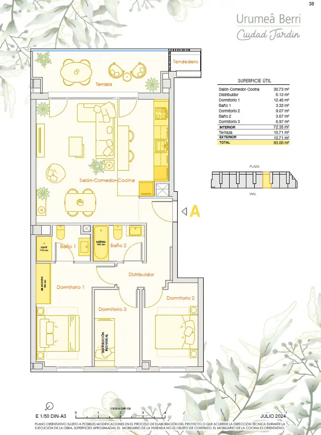 The 82 m² apartment combines modern comfort, smart design, and a sustainable lifestyle. A bright living room opens onto a spacious terrace, while the fully equipped kitchen features contemporary appliances. Three cozy bedrooms and two elegant bathrooms complete the layout — designed with every detail in mind to create a welcoming family home or a perfect base for relocation to the Basque Country.